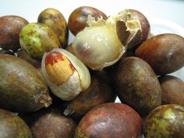 Buah ini sekilas terlihat seperti buah kedondong dengan kulit hijau kecokelatan dan bentuknya agak oval. Cara membuka buah ini, pecahkan kulit buah dengan tekanan dari ibu jari. Cangkangnya tidak terlalu keras dan terdapat selaput tipis pembungkus di dalamnya.